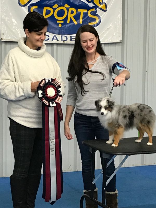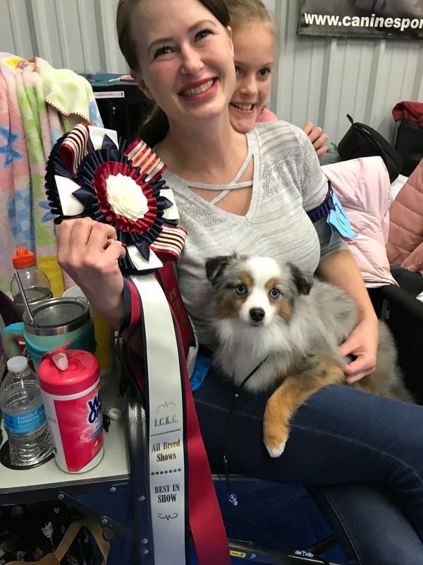 Bennett is a puppy we kept back from a Delilah and Puff litter; Delilah and Puff have been one of our favorite crosses! Bennett is eager to please and a fast learner. He seems to love the confirmation show ring, much like his sire, Puff. Bennett is also excelling at Rally and has earned the Canine Good Citizen title through AKC. He is 12" and 12 lbs. We are excited to announce Bennett made the ICKC Top Ten 2024 in both the Puppy and Junior Dog categories. He is tested Full panel clear with PawPrints Genetics. Bennett is duel registered with ASDR as Toy Australian Shepherd and with AKC as Miniature American Shepherd. Bennett has been awarded multiple Best Puppy in Show, Reserve Best Puppy In Show, Best Junior Dog in Show, Reserve Best Junior Dog In show, Reserve Best In Show (adult), and Group placements.