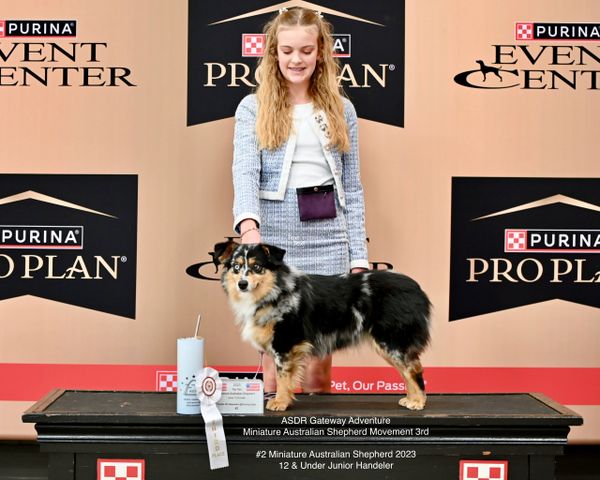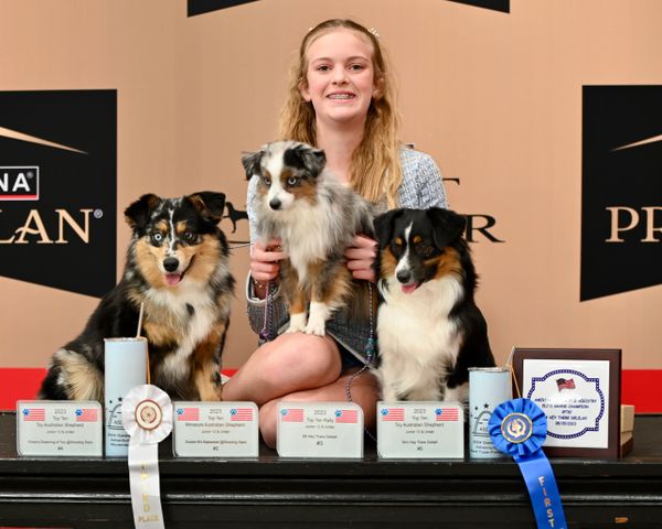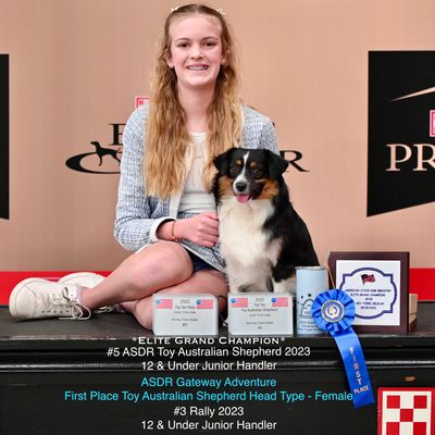 2023 ASDR Top 5 Toy Aussie Junior Handled ghs 18 pounds. Delilah is low-medium energy, confident, and easygoing. She has been shown by my daughter in confirmation, rally, and , junior showmanship . Lillian titled Delilah in Rally on their first try. Delilah has earned her International Grand Championship, Intercontinental Championship titles with ICKC and her Elite Grand Championship with ASDR. She has she has multiple class wins, Best of Breeds, Group placements, and Best In Show. Delilah tested clear on a full breed panel by PawPrint genetics, is non-merle, and is red factored. She is now duel registered with ASDR as Toy Australian Shepherd and with AKC as Miniature American Shepherd.