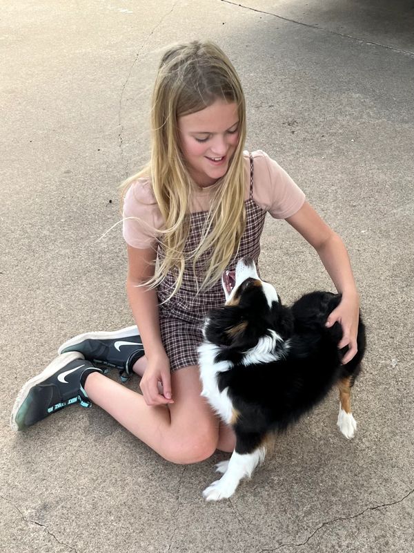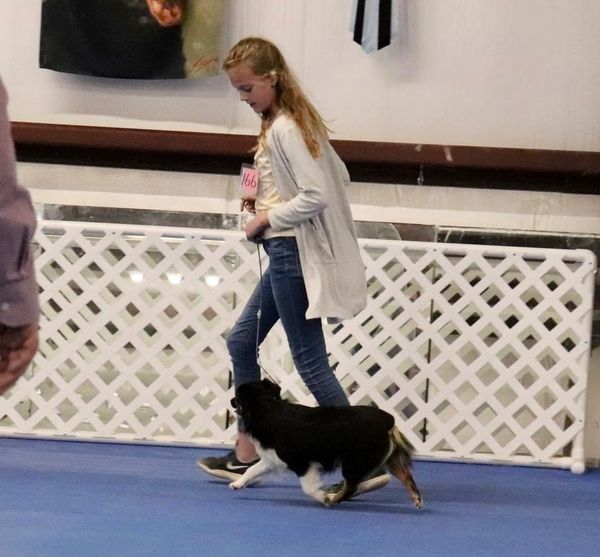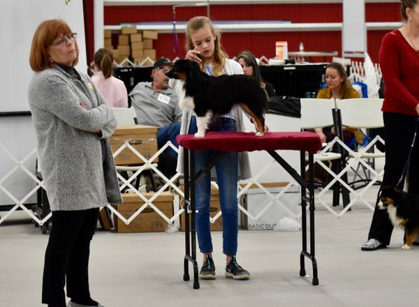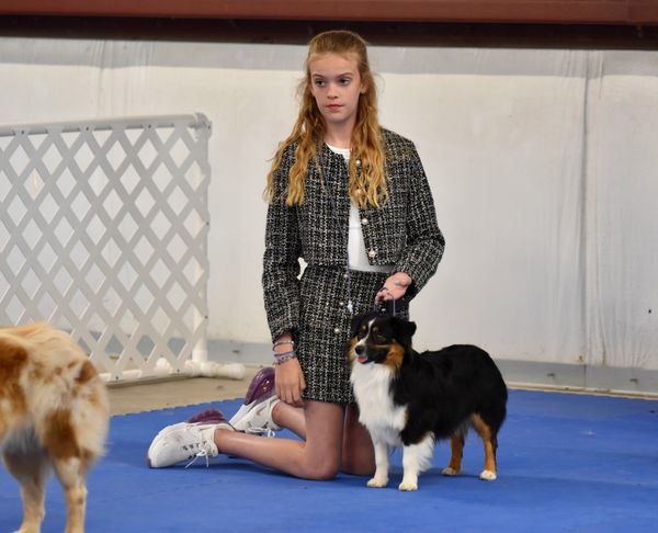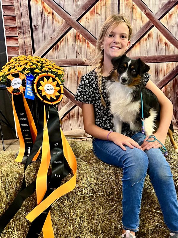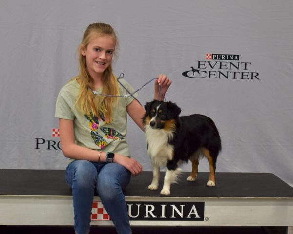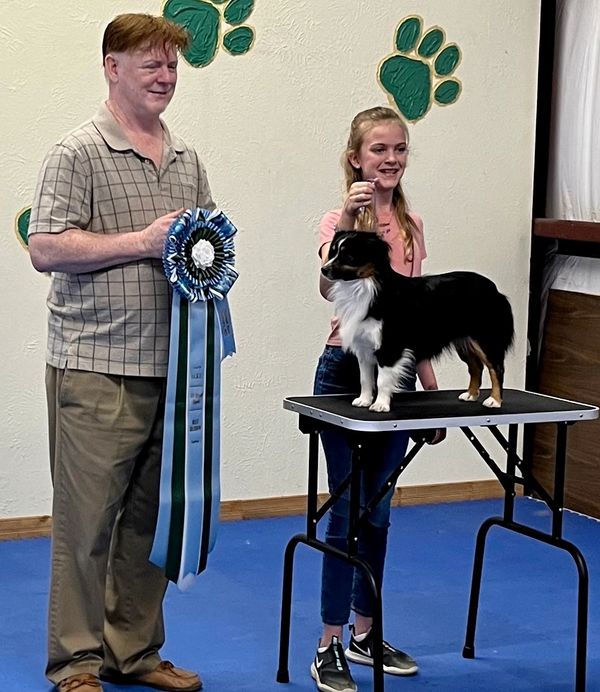Jewel came to us from The Double M Ranch and we are very please with how she has matured. She became Lillan's Junior Showmanship dog when Delilah was home with her puppies. Jewel is very devoted and loyal, while also welcoming when greeting new people. She is a solid built girl at 14.5" and 22 lbs classifying her as a Miniature Australian Shepherd with ASDR. She is full panel clear by PawPrints Genetics and red factored. Some of Jewels accomplishments include placing 3rd at Nationals in the specialty class "Movement" for the Mini Aussie Breed. She has also been class winner, best female, and best of breed in addition to helping Lillian with multiple Reserve and Best Junior Handler in Shows.