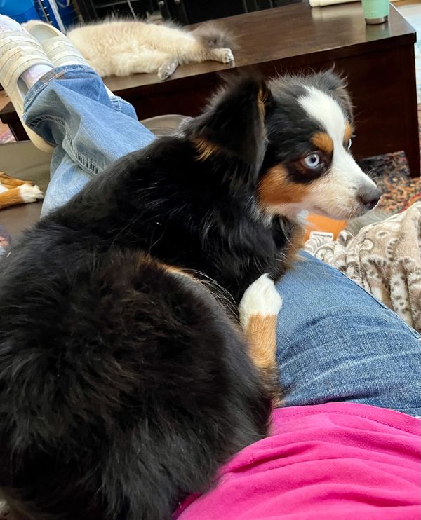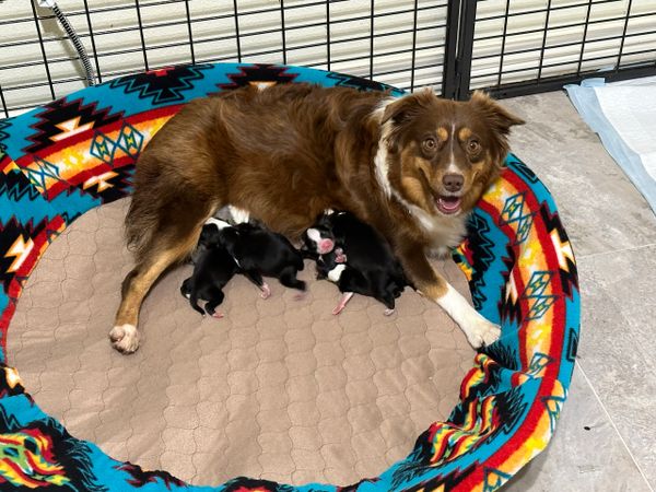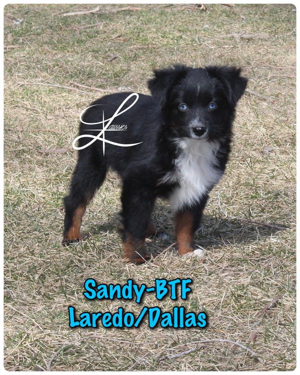Mysti is from Cross L Mini Aussies. She is. a striking black tri with bright blue eyes. Mysti is registered with ASDR and AKC. She is 15" and 22 lbs. She is a sweet girl and does well socially. So far we have been loving what she is producing!